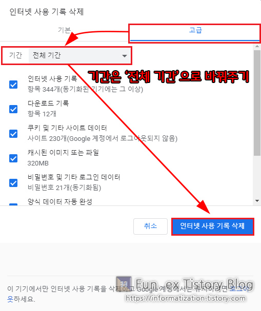 <인터넷 사용 기록 삭제> 창에서 [고급]을 눌러주시고, 기간을 '전체 기간'으로 설정해주세요.