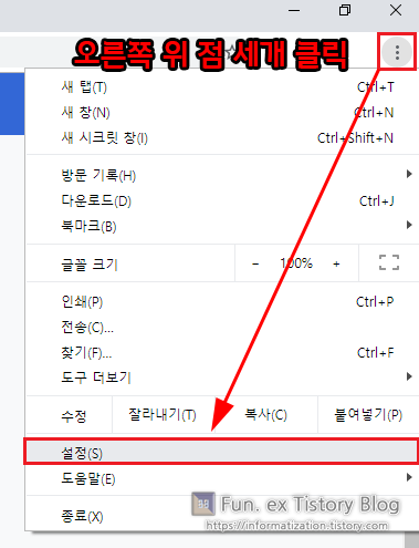 [설정]을 눌러 크롬 설정 페이지로 들어가 줍니다.