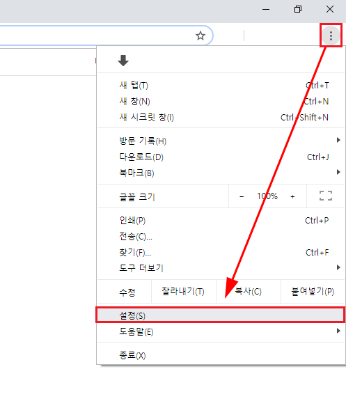 크롬을 실행 시킨 후, 오른쪽 상단에 있는 점 세개 모양을 클릭하고