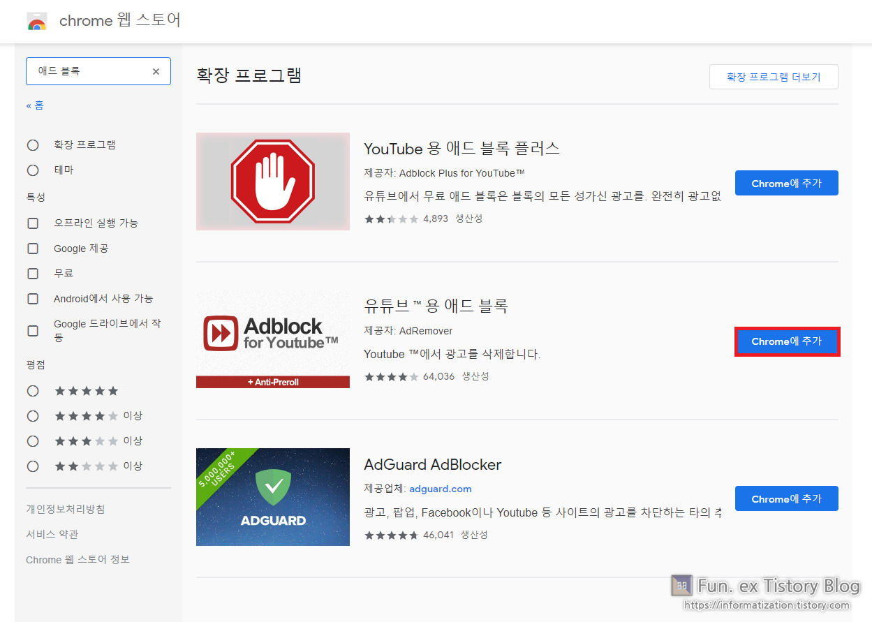 가장 많이 알려져 있고 두번째에 위치한 '유튜브용 애드 블록'을